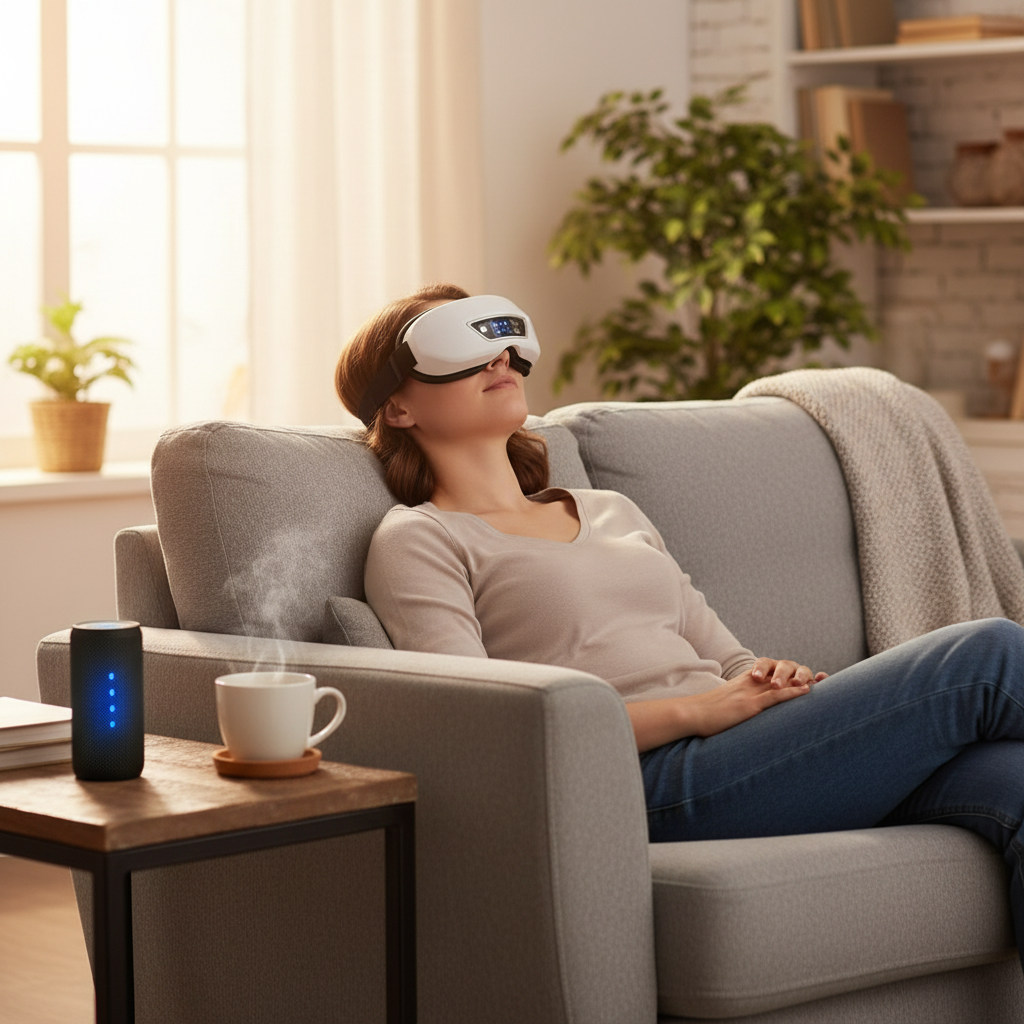 Massage 6D intelligent qui combine vibrations, compression airbag et musique relaxante pour des yeux reposés et un regard lumineux au quotidien.